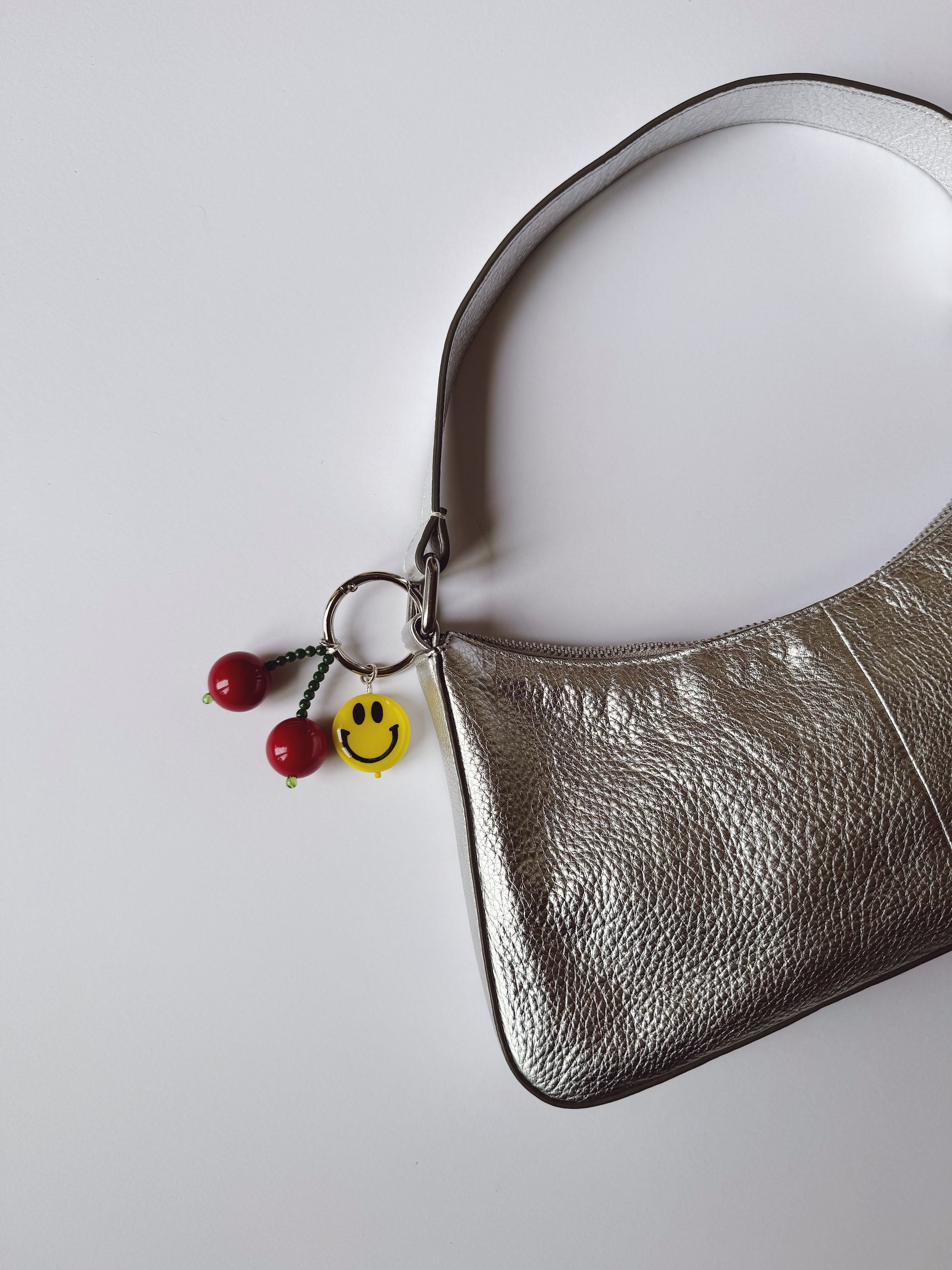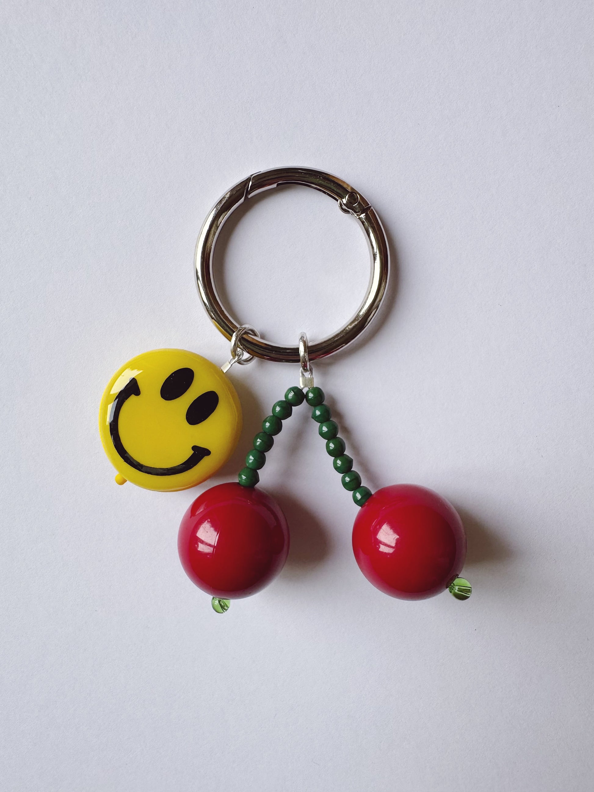 Vintage red beads and green stem beads are resin and the polymer clay BIG smiley has been handmade exclusively for Studio Bowe. The large keyring can accommodate any bag strap and the charm is super lightweight.