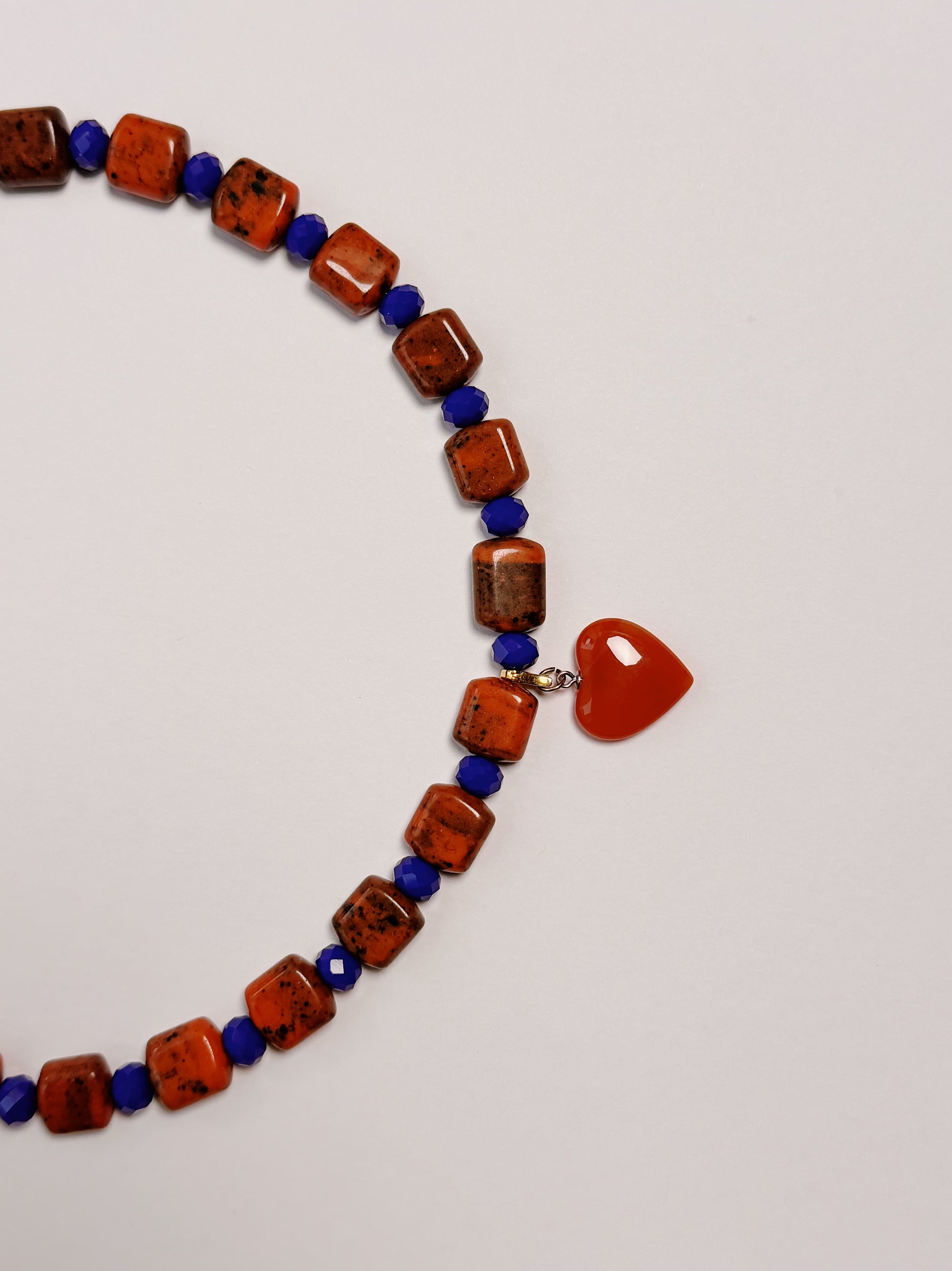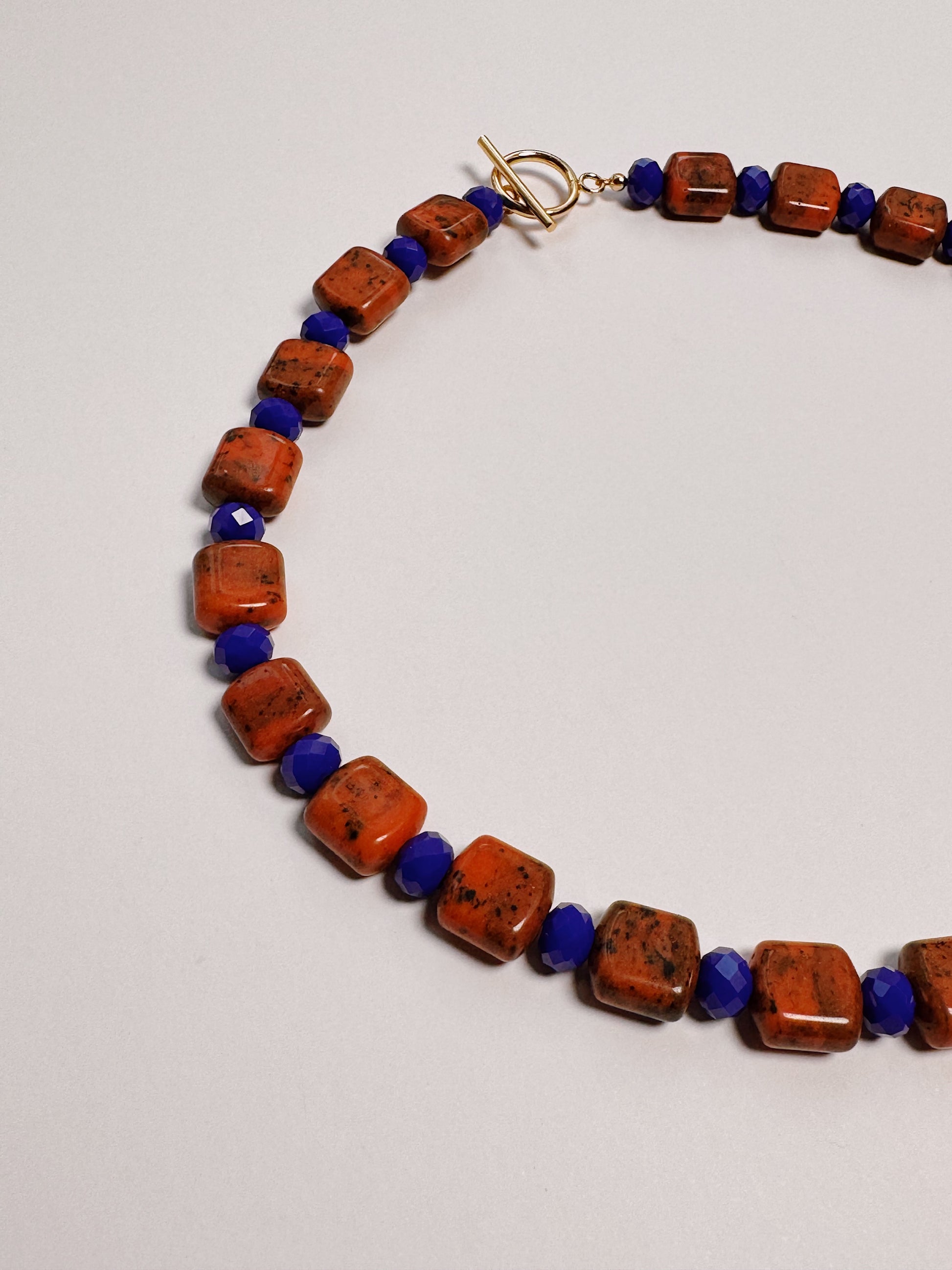 Orange flecked cuboid beads (ceramic I think) contrasting with a punchy yves klein blue faceted bead.