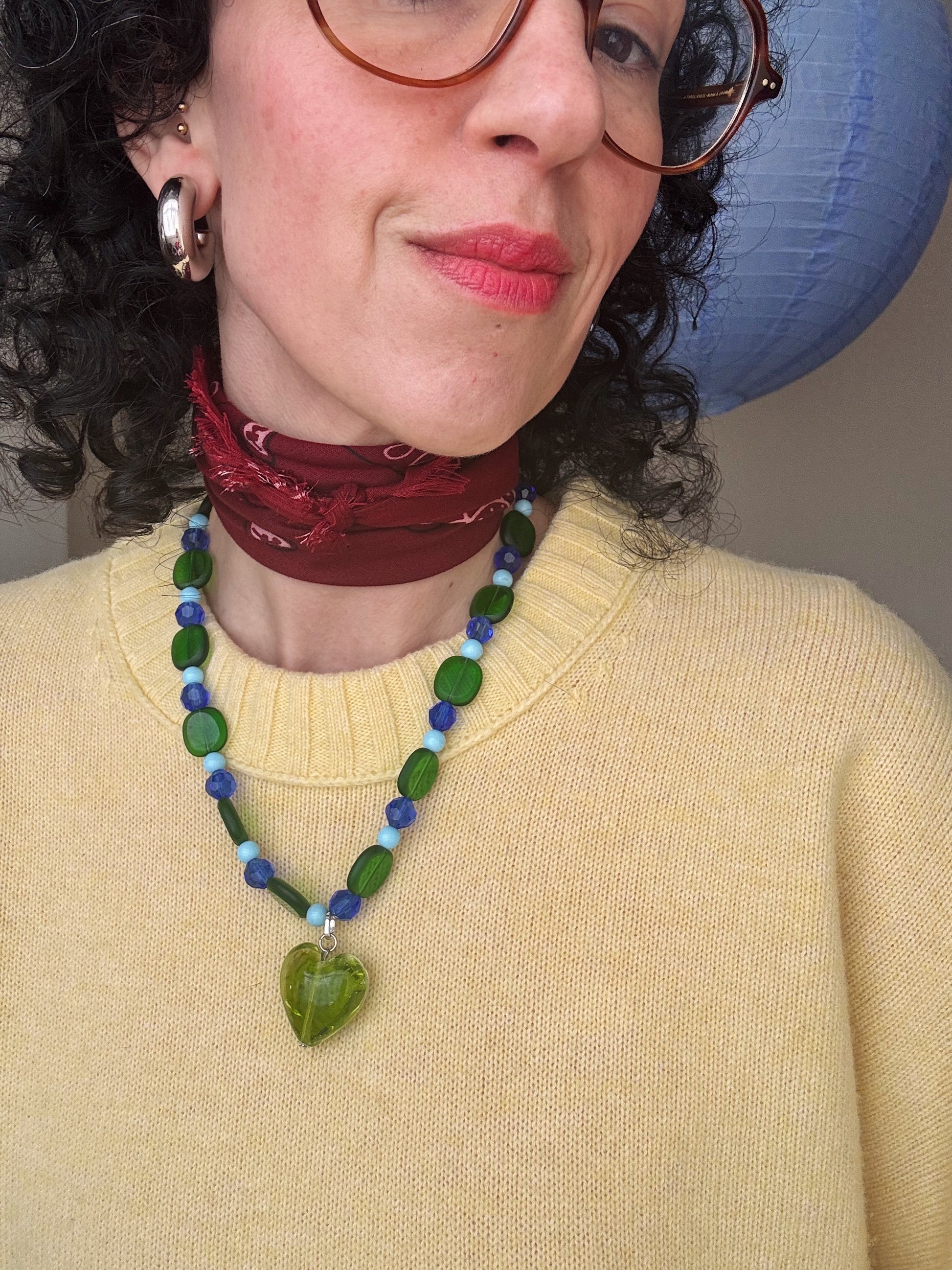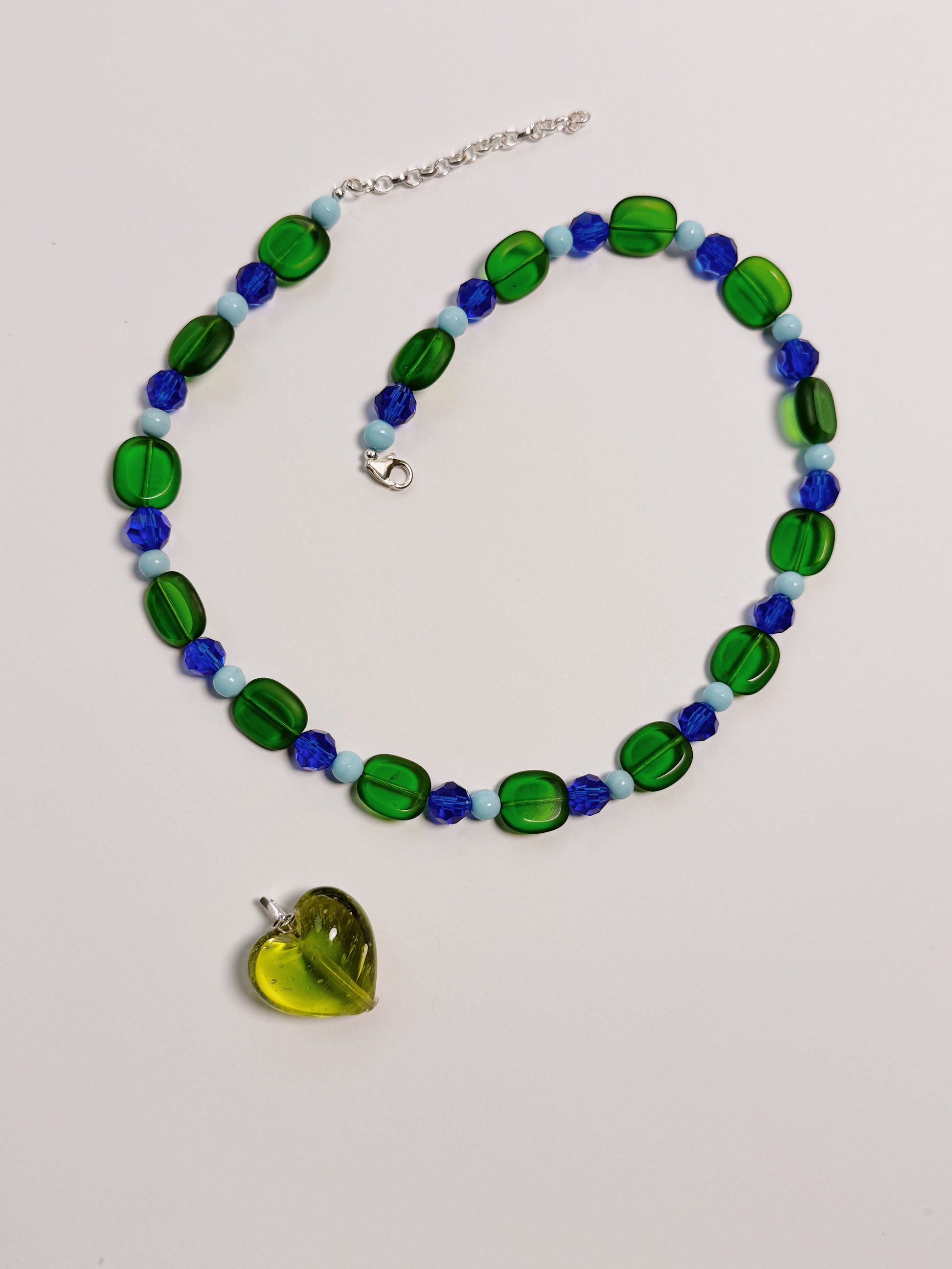 Chubby green glass heart pendant is detachable for 2 necklaces in 1