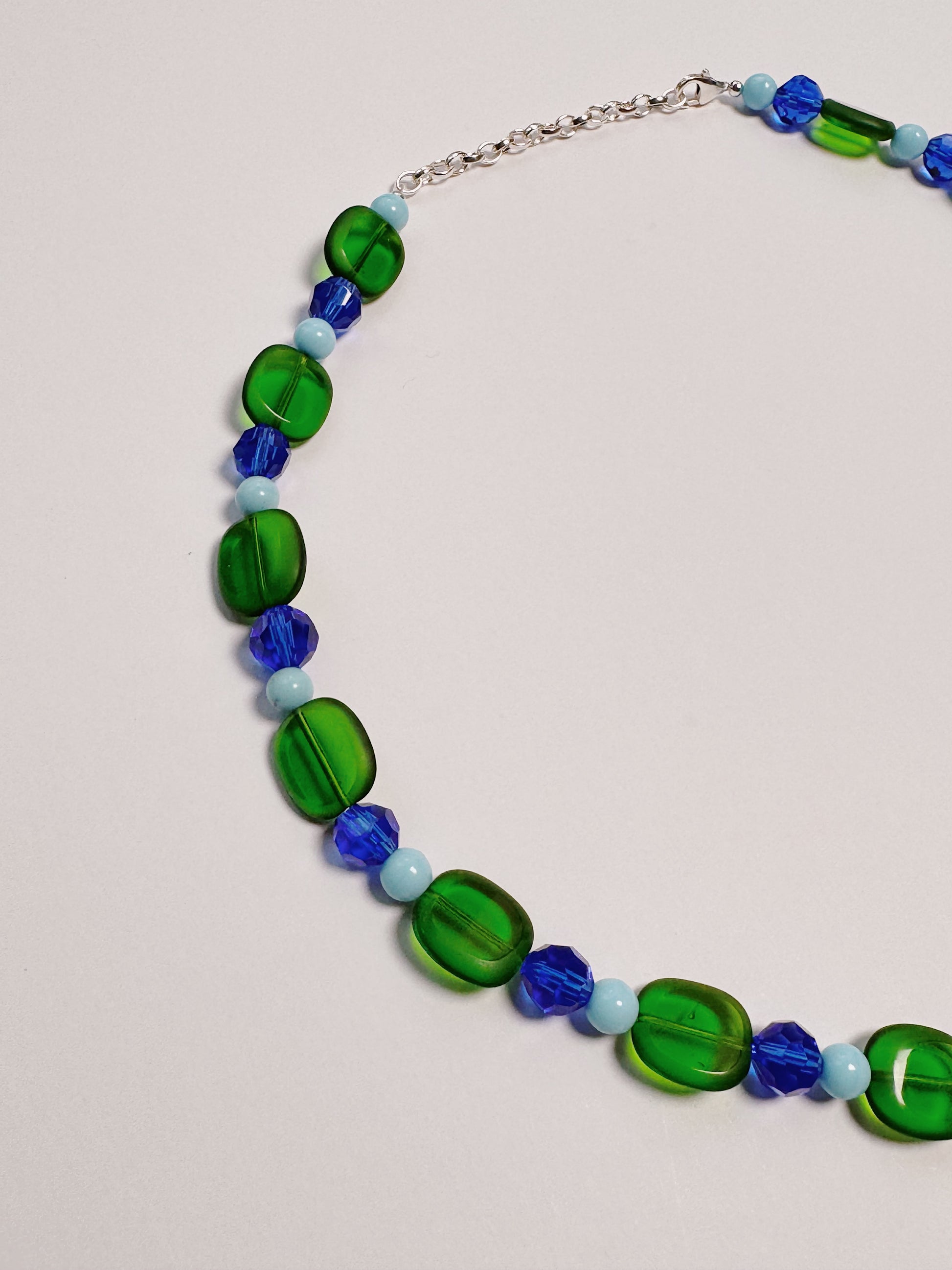 Apple green square glass beads with a pop of cobalt and sky blue (all preloved and vintage beads)