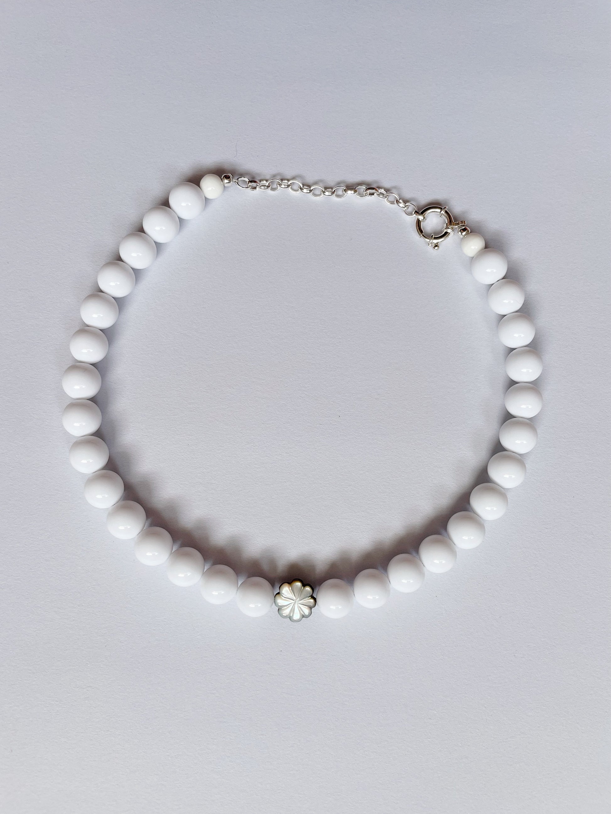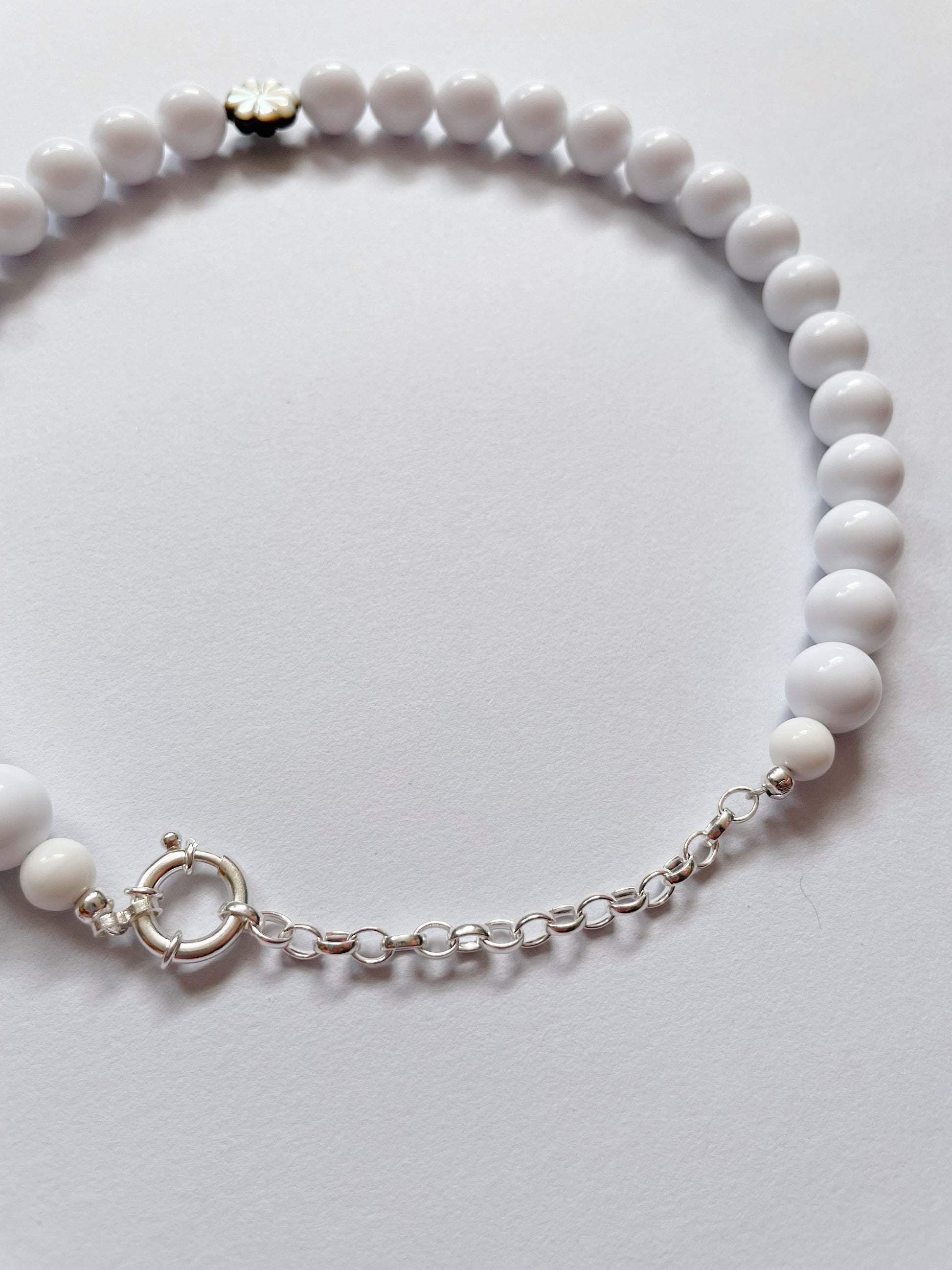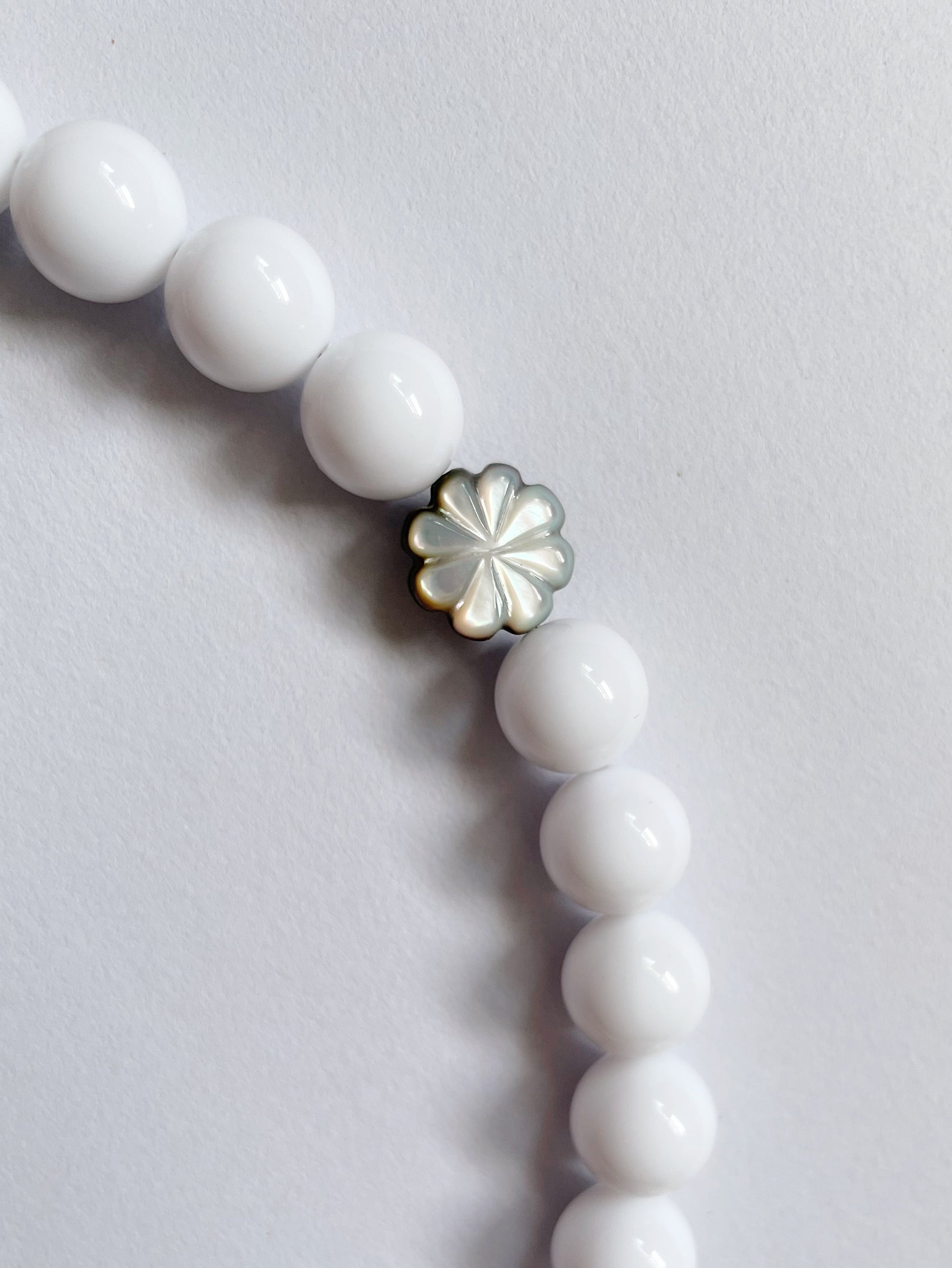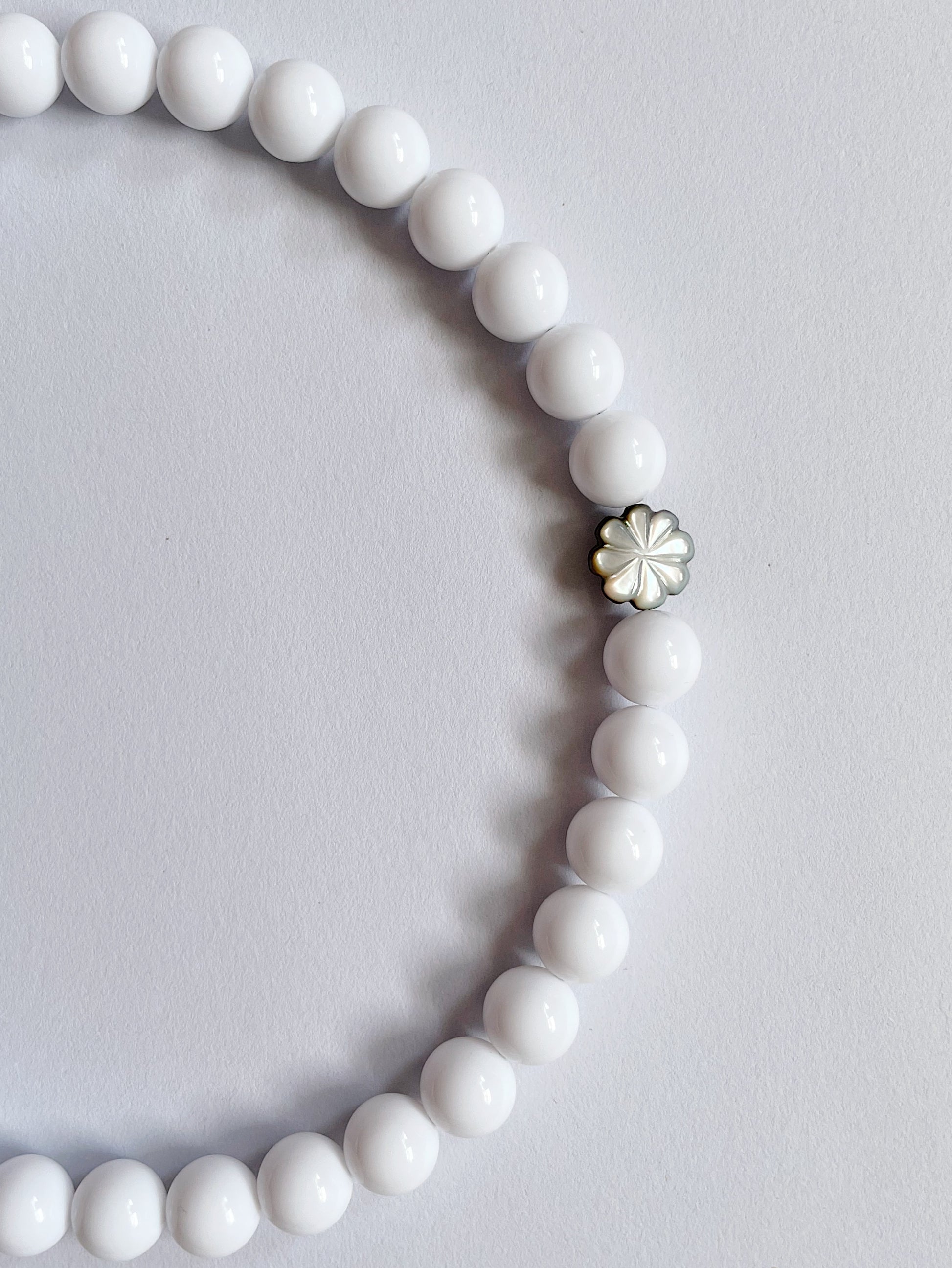 Simple and clean design featuring creamy white resin beads with a mother of pearl flower bead.