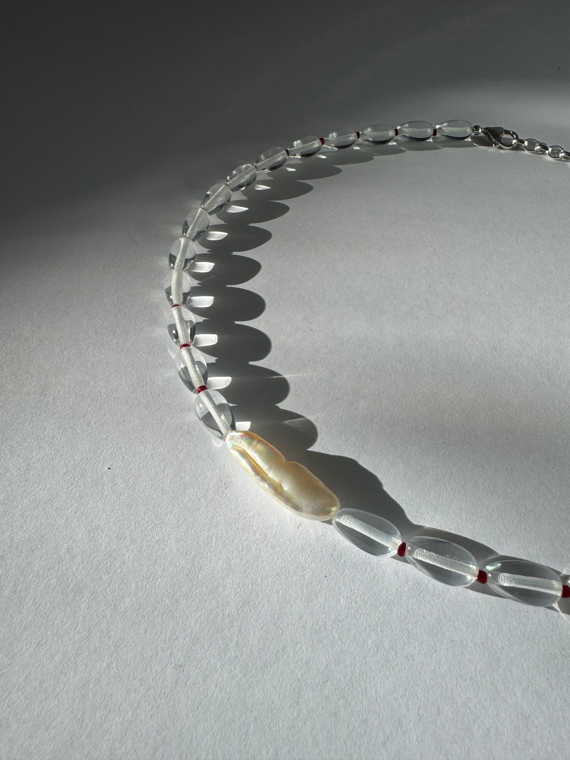 A delicate mix of crystal clear glass teardrop beads, micro cranberry beads and a central large freshwater Biwa pearl. Designed to sit at collarbone length.