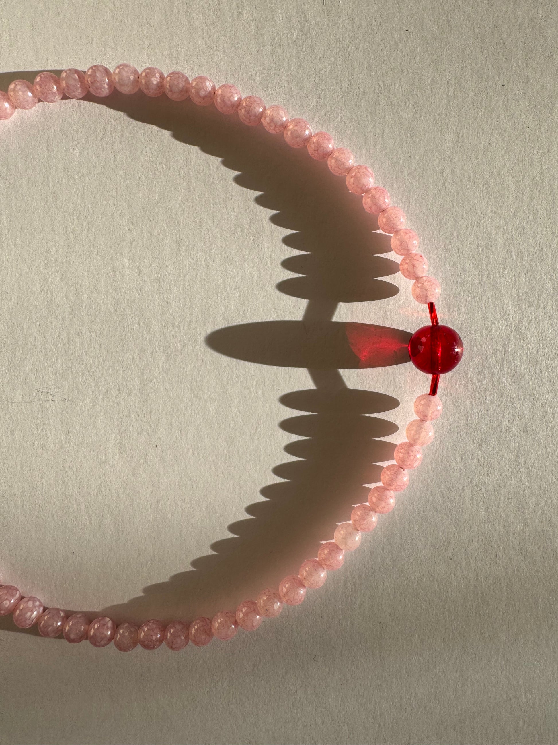A longer length necklace designed with a pendant blood red glass bead in its centre. Choose between powder pink cloudy glass beads or stunning blue lapis lazuli gemstones.