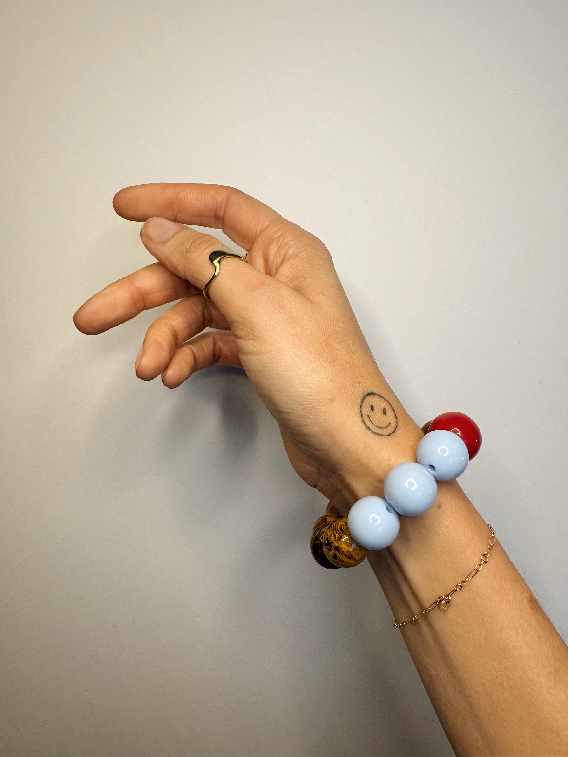 Round resin beads in toffee swirl and sky blue with a playful pop of red.