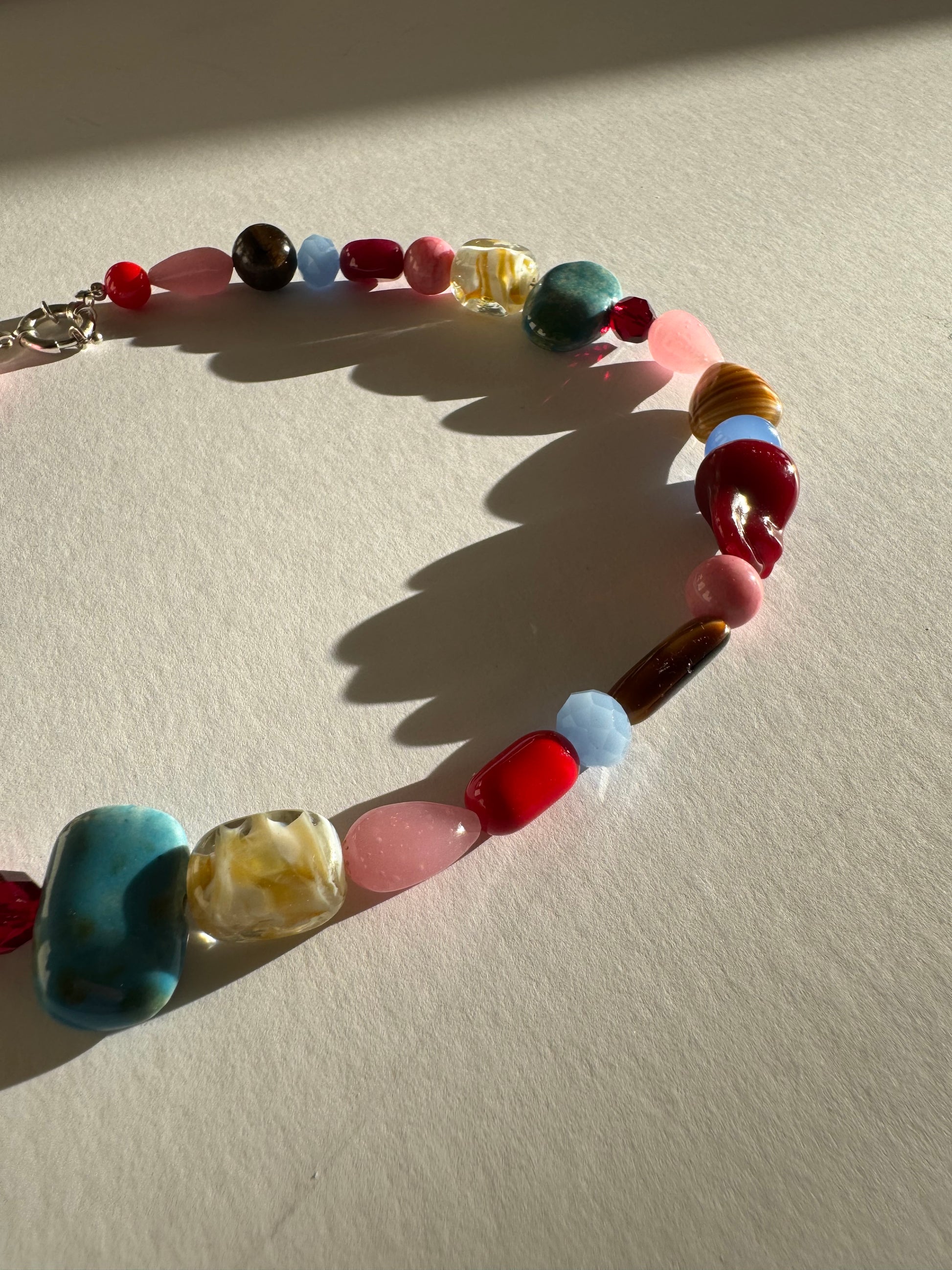 A charming necklace mixing colours and shapes chosen in a seemingly chaotic manner. Each of the necklaces are very slightly different but all use the same colour combination of bright red, powder pink, rich burgundy, cornflower blue and chestnut brown.