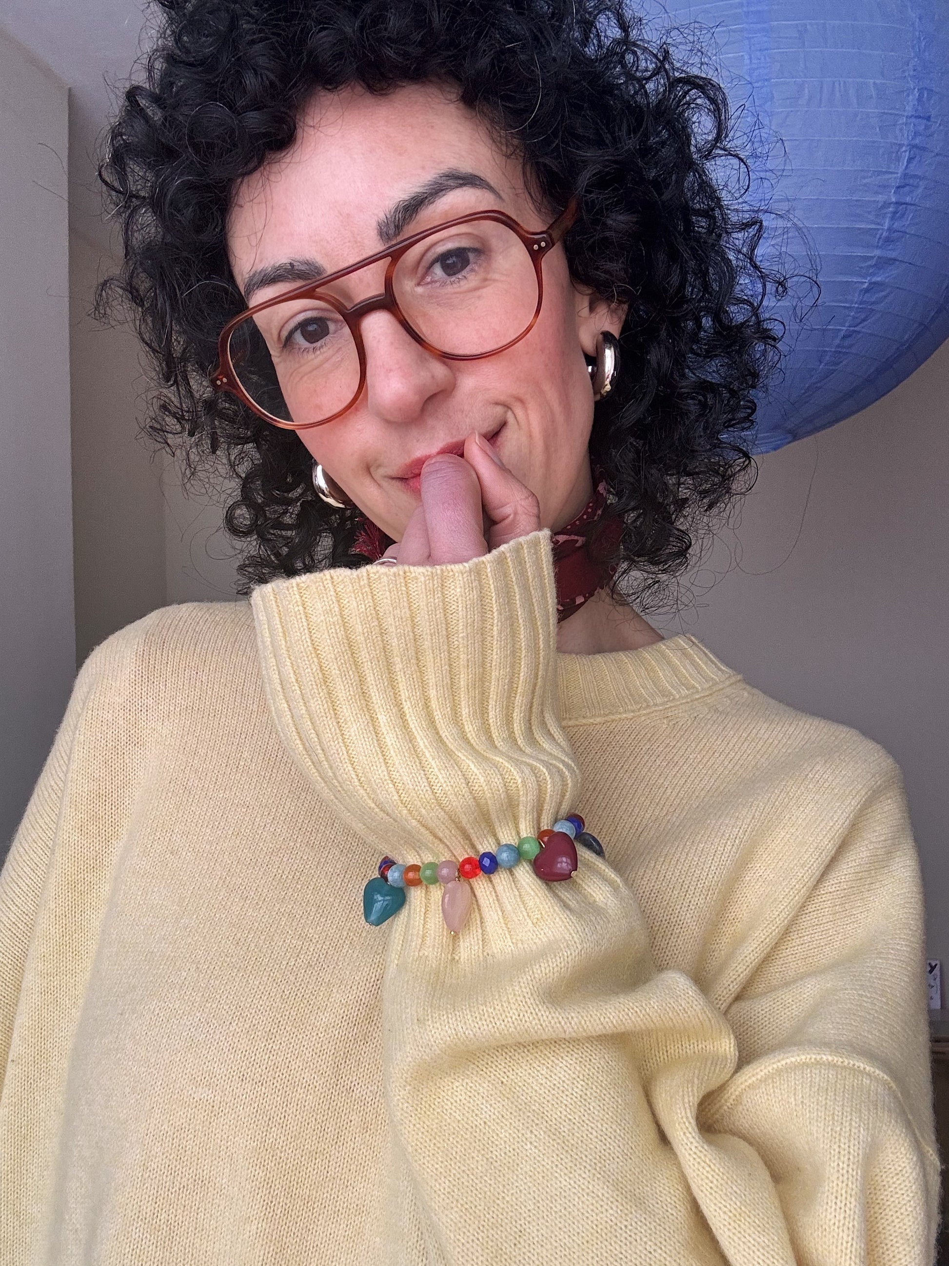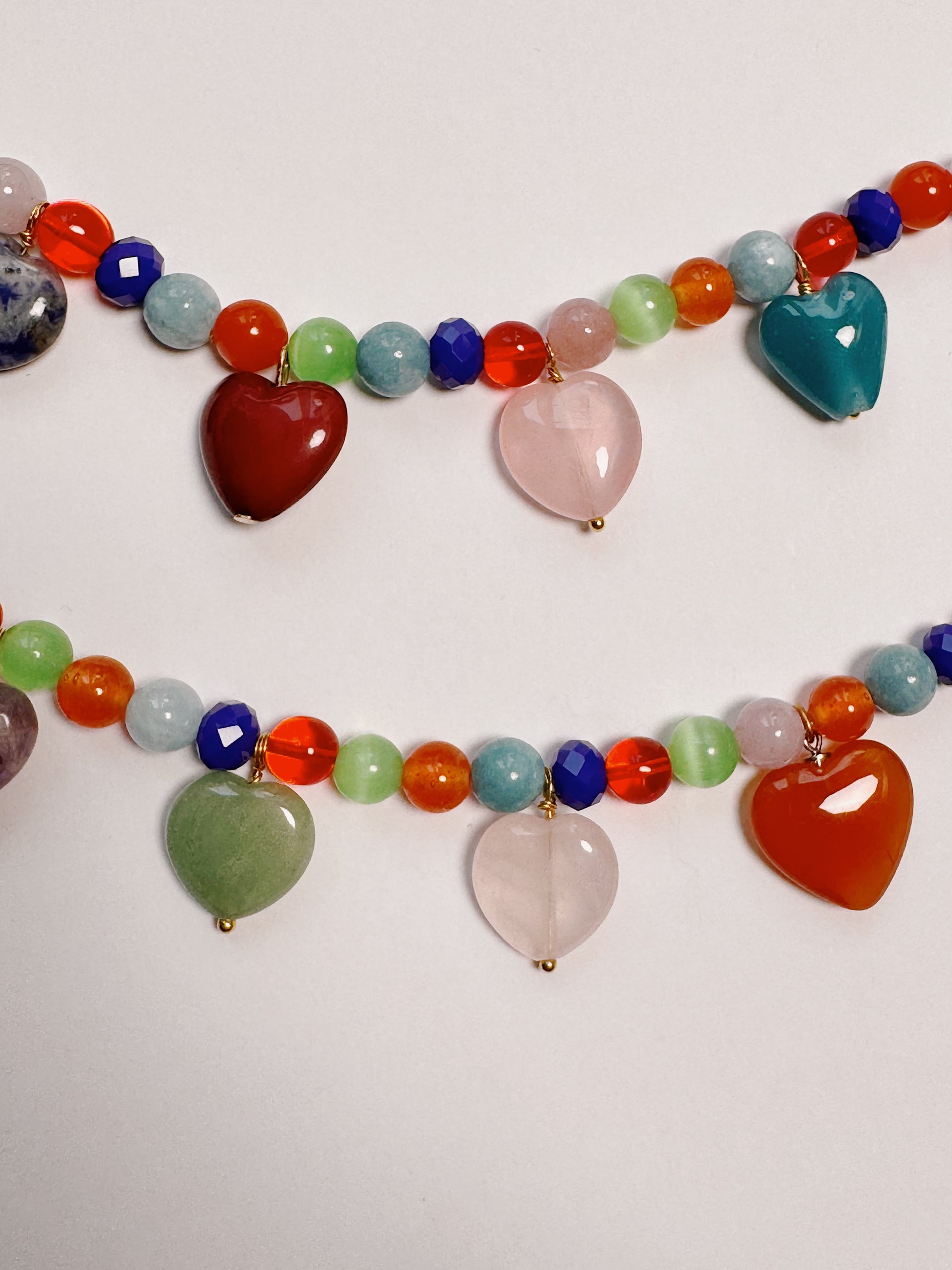 Multicoloured glass bead bracelet adorned with various coloured glass and ceramic heart charms
